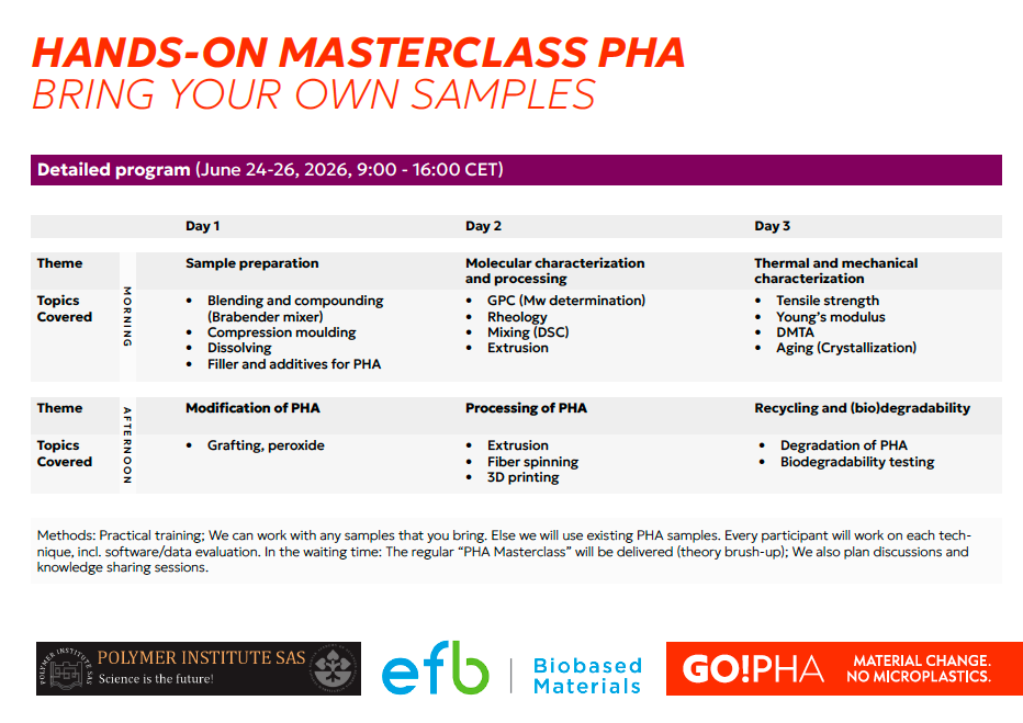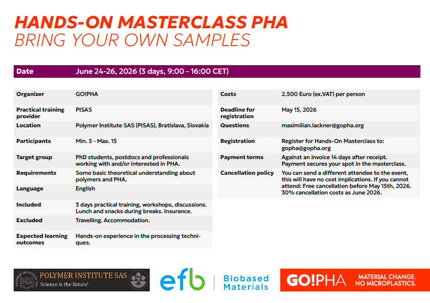 GO!PHA is organizing a 3-day hands-on PHA Masterclass on June 24–26, 2026, hosted at the Polymer Institute SAS (PISAS) in Bratislava, Slovakia. This practical training is designed for PhD students, postdocs, and professionals working with or interested in PHA, and focuses on processing, molecular characterization, modification, recycling, and biodegradability testing. Participants will gain direct experience with key techniques including extrusion, fiber spinning, rheology, thermal and mechanical characterization, and biodegradability evaluation.